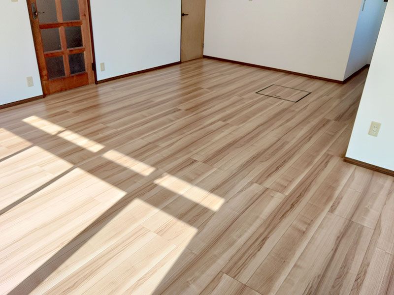 既設の床が不陸につき調整しながらの床貼りの作業となりましたが、不陸も解消されて歩き心地も良くなったかと思います。