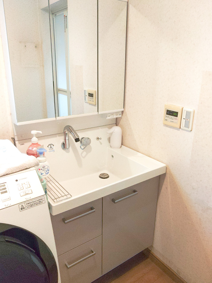 洗面化粧台:LIXIL ピアラ 間口750mm 三面鏡 引出しタイプ 浴室ドア:LIXIL 浴室中折れドアSF型 |